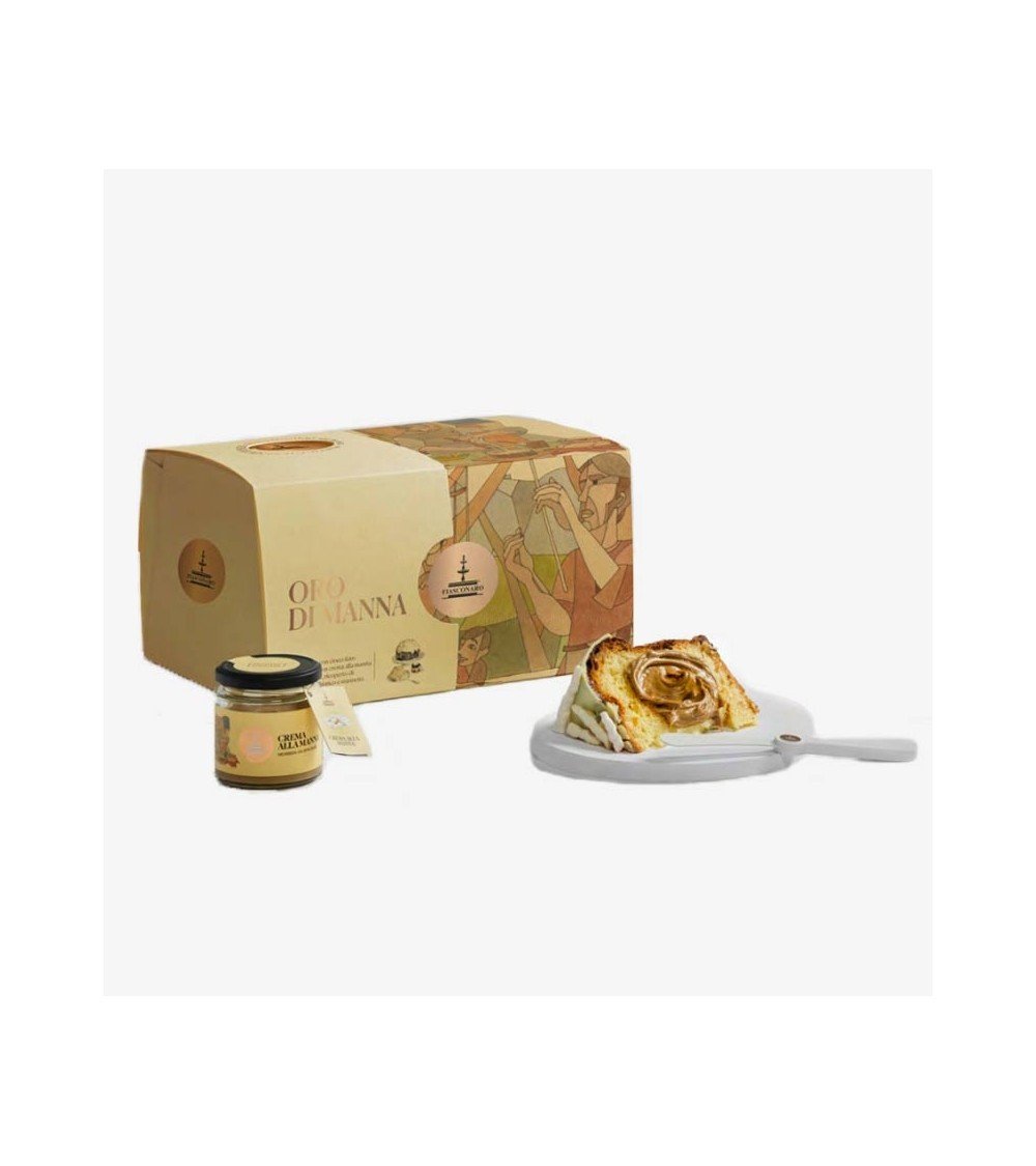 Questa confezione, ideata da Fiasconaro, contiene unย Panettone Artigianaleย (820g) ricoperto da una glassa diย Cioccolato Bianco e Mannettiย ed un vasetto diย Crema diย Mannaย (180g) col relativo spalmino. Il nostro consiglio รจ di tagliare una fetta di questo panettone, spalmare la crema abbinata e godersi il momento! Ottimo anche come Ideaย Regalo!